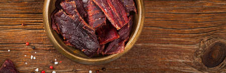 Beef jerky, dried meat, rustic country style, delicious meat snack, copy space