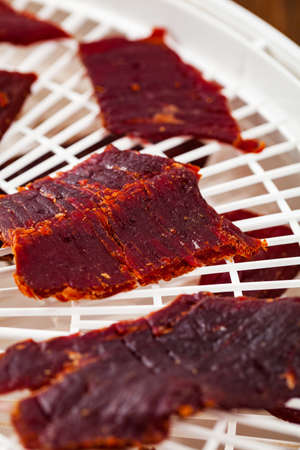 Homemade Beef Jerky with a dehydrator. Selective focus.