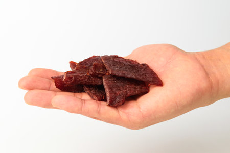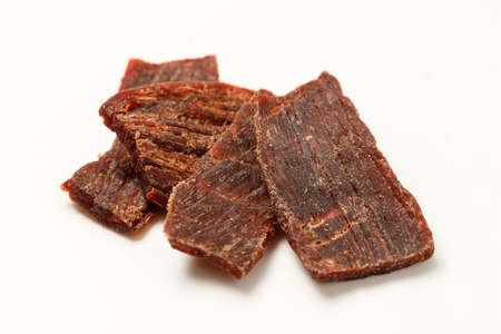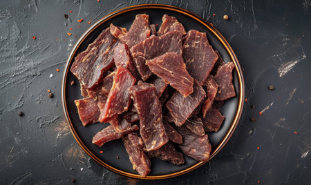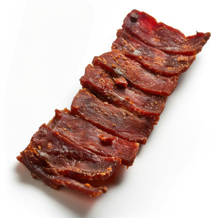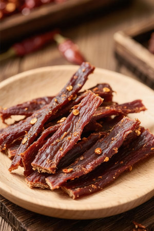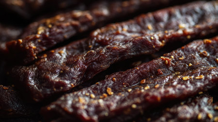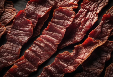 A close-up of beef jerky strips, dried and seasoned, ready for a snack