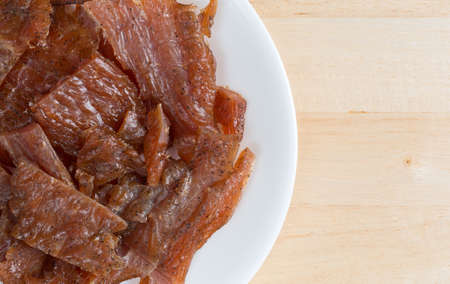 Top close view of a turkey jerky pieces on a white plate atop a wood table.