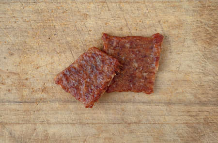 Chewy and delicious beef jerky, dried meat cut into slices on a wooden background, warm picture