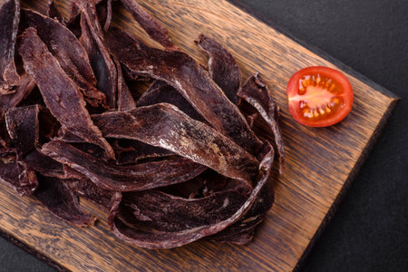 Delicious dried veal or turkey jerky with salt, spices and herbs on a dark concrete background