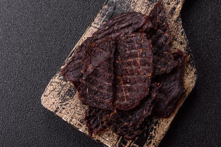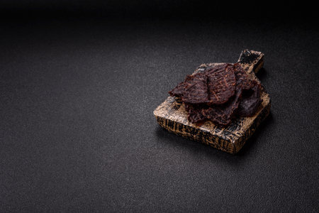 Jerky, dried meat slices with salt and spices on a dark concrete background