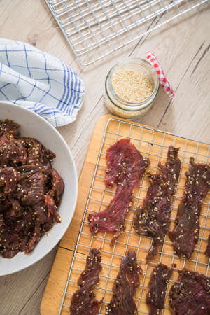Asian style marinated raw beef strips for homemade jerky dried meat with sesame and chili on dehydrator drying tray, wooden board in light domestic kitchen for long term storage