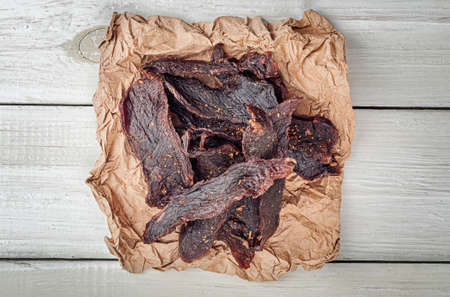 Beef jerky meat. Dried sliced meat on a paper. Top view.