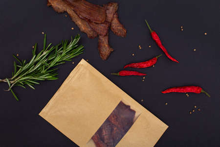 Jerky snacks, red papper, rosemary and craft package on black background. Mockup. Dried and spiced meat for beer.