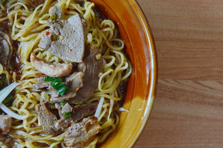The close-up photos of the food name Tom Yum Pork noodles look very delicious.