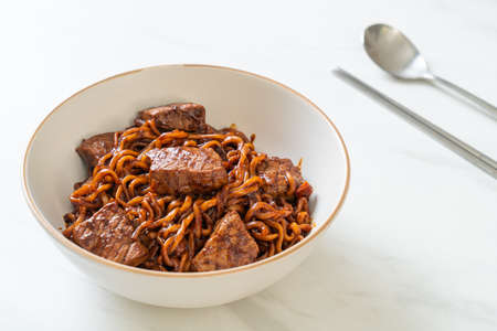 Jjapaguri or Chapaguri, Korean Black Beans Spicy Noodles with Beef - Korean food style
