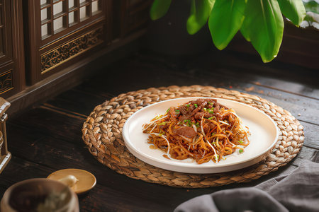 rice noodles with spicy pork sauce , Thai cuisine
