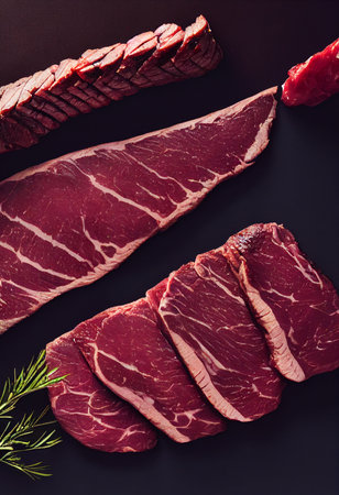 Juicy, richly marbled beef steaks rest on a sleek black tray, accented with fresh herbs and vibrant spices, evoking mouthwatering elegance and craftsm