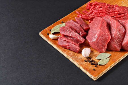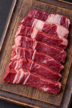 Fresh raw beef cut into slices with salt, spices on a dark concrete background