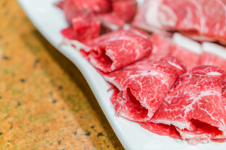 Raw freshly thin beef for hot pot and Japanese sukiyaki. Close up