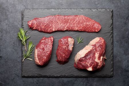 Variety of fresh raw beef steaks with spices on stone board. Top view flat lay