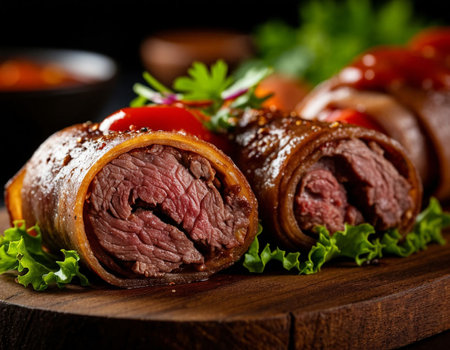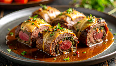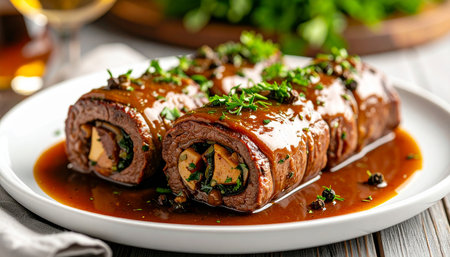 Succulent beef rolls garnished with fresh herbs, perfect for gourmet cuisine. Ideal for catering, home cooking, or festive dining occasions.
