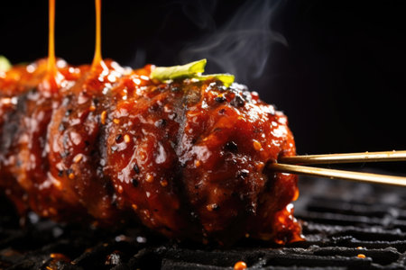 macro shot of a single bbq meatball skewer with juicy texture, created with generative ai