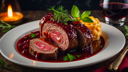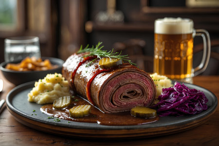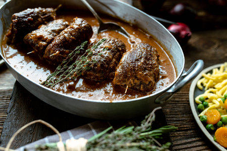 Rustic meat dish with german beef roulades with delicious gravy