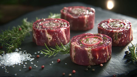 Seasoned beef rolls, garnished with fresh rosemary, coarse salt, and peppercorns, rest on a dark slate surface, perfectly prepped and ready for a delicious cooking experience
