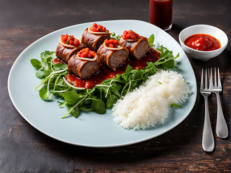 Delicious grilled beef skewers served on a bed of fresh arugula with a side of fluffy white rice and tangy tomato sauce. Perfect for a healthy and elegant meal.