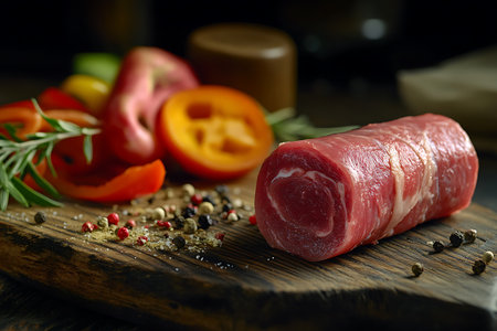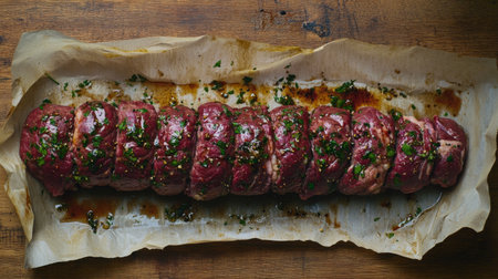 A captivating shot of freshly cut beef tenderloin wrapped in butcher paper, placed on a wooden table, with herbs and spices sprinkled around for flavor