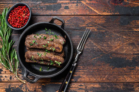 Grilled mince meat sausages in a pan. Dark wooden background. Top view. Copy space.