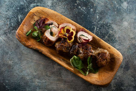Meat roll with lentils and herbs. The food in the restaurant. Food styling and restaurant meal serving.