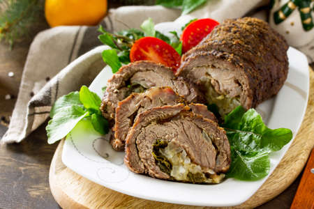Stuffed Beef Roll with Pear and Cheese on a festive Christmas table.