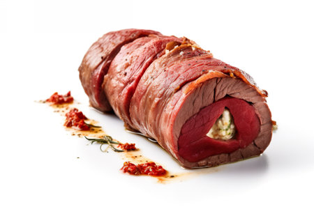 Matambre - Stuffed and rolled flank steak on white background. Generative AI.