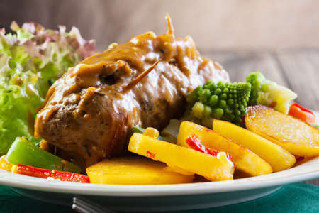 Pork rolls with prepared potatoes and vegetables on plate