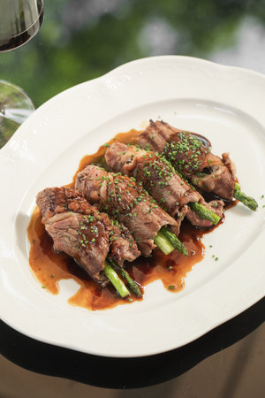 Portion of beef and asparagus rolls appetizer