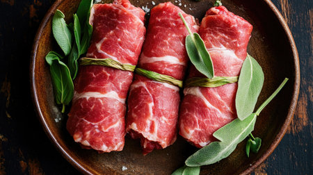 This striking overhead image showcases raw saltimbocca wrapped in meat and fresh herbs, perfect for culinary inspiration or food presentation.