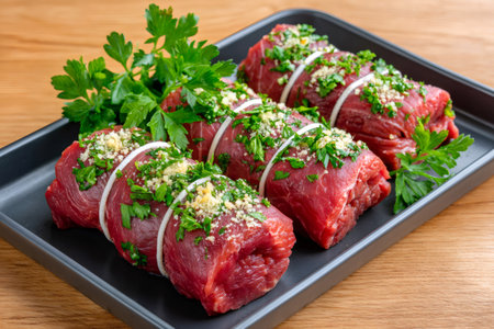 Raw beef roulades prepared in a baking pan, seasoned with fresh parsley and minced garlic
