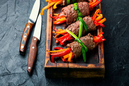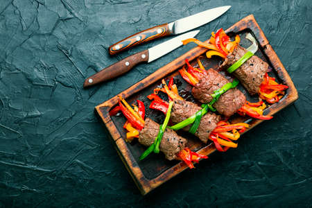 Delicious beef rolls stuffed with sweet pepper.Meat roundelay on kitchen board.Copy space