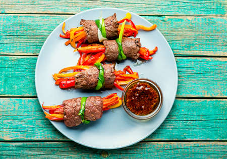 Delicious beef rolls stuffed with sweet pepper