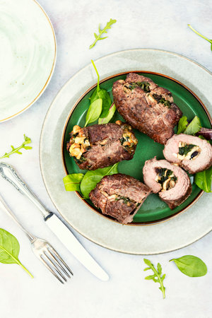Veal meat rolls stuffed with mushrooms and herbs. Dish of beef