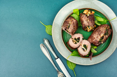 Beef meat rolls stuffed with mushrooms and greens. Homemade baked beef. Space for text