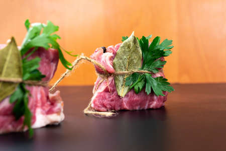 Bay leaves and parsley are tied to fresh meat. Black background