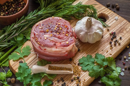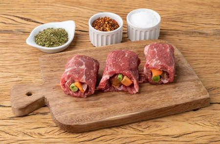 Rolled beef or roulade, vegetable and bacon stuffed meat over wooden table with seasonings.