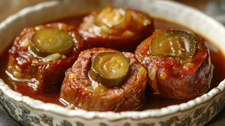 Delicious savory meat rolls featuring tender beef, pickles, and a rich sauce. Perfect for a hearty meal, this dish combines flavor and tradition beautifully.