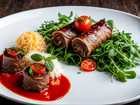 A beautifully plated gourmet beef roll dish featuring tender beef rolls garnished with fresh greens, cherry tomatoes, and a rich sauce. Accompanied by a side of spiralized vegetables and a red sauce.