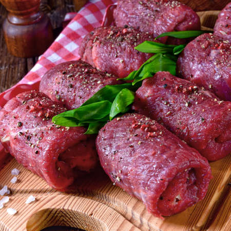 Meat rolls tied with string are on plate ready to be fried. French gourmet cuisine.