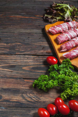 Bacon rolls with tomato, parsley on wooden background. Text place.