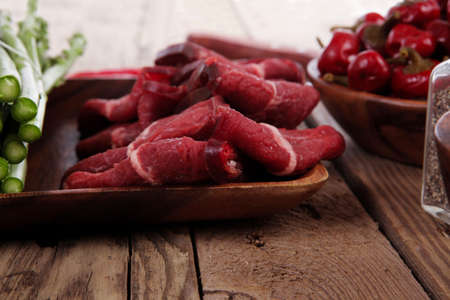 Aged beef for cooking steak in a cooking class. Raw beef and greens, close-up.