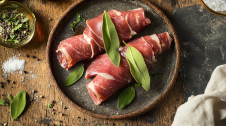 This striking overhead image showcases raw saltimbocca wrapped in meat and fresh herbs, perfect for culinary inspiration or food presentation.