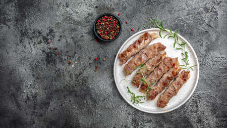 rolls of meat with bacon, chevapchichi or Kofta kebab, banner, menu, recipe place for text, top view,