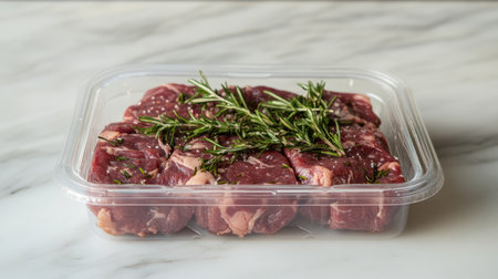 A clear plastic container holds fresh raw beef cuts garnished with aromatic rosemary, ideal for culinary use, cooking recipes, and meal preparations.