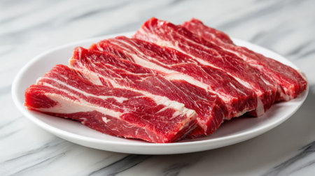 Slices of fresh beef ribs are arranged neatly on a white plate. The marbled meat showcases rich colors, ideal for grilling, stewing, or preparing delicious meals.