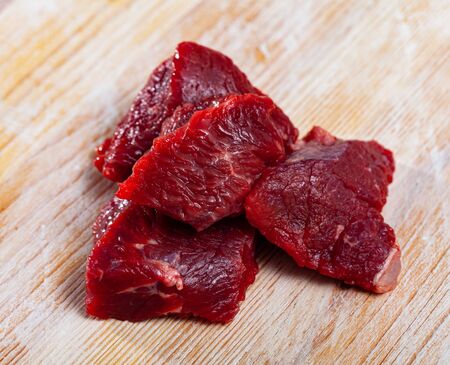 Home cooking. Pieces of fresh raw beef prepared for stewing on wooden table