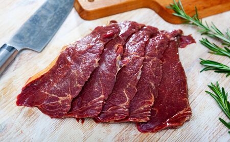 Ingredients for cooking. Sliced fresh raw horse meat fillet on wooden table with rosemary