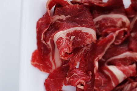 Close-up of thinly sliced premium beef arranged neatly on a platter, awaiting to be cooked in a flavorful broth
