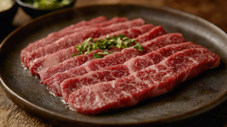 A premium set of raw Wagyu A5 beef slices, ready for yakiniku, arranged on a plate with herbs. Rich marbling and color make it a stunning choice for culinary visuals.